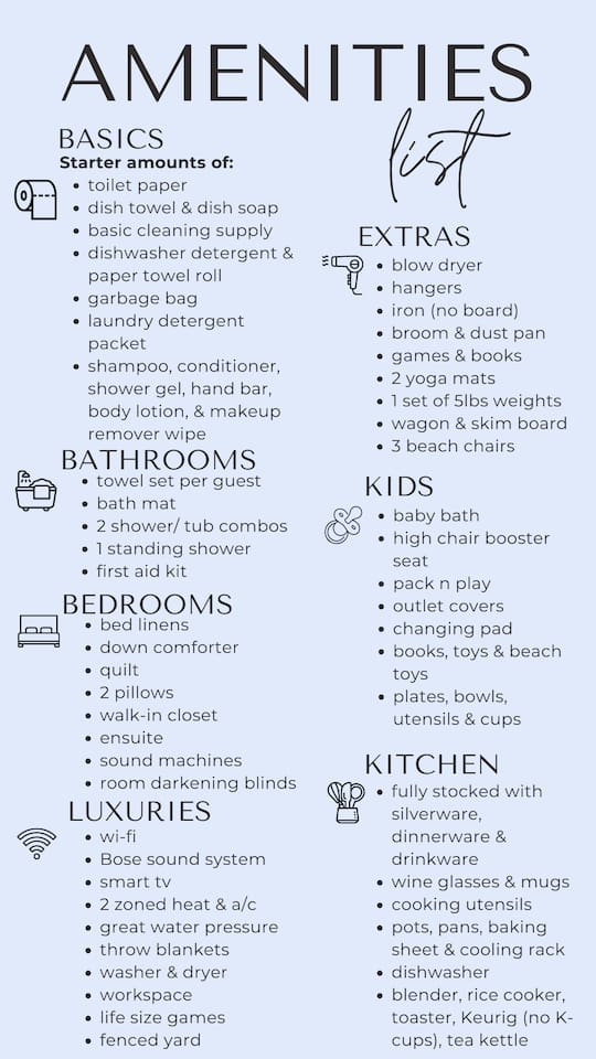 - Essentials Towels, bed sheets, soap, toilet paper, and pillows